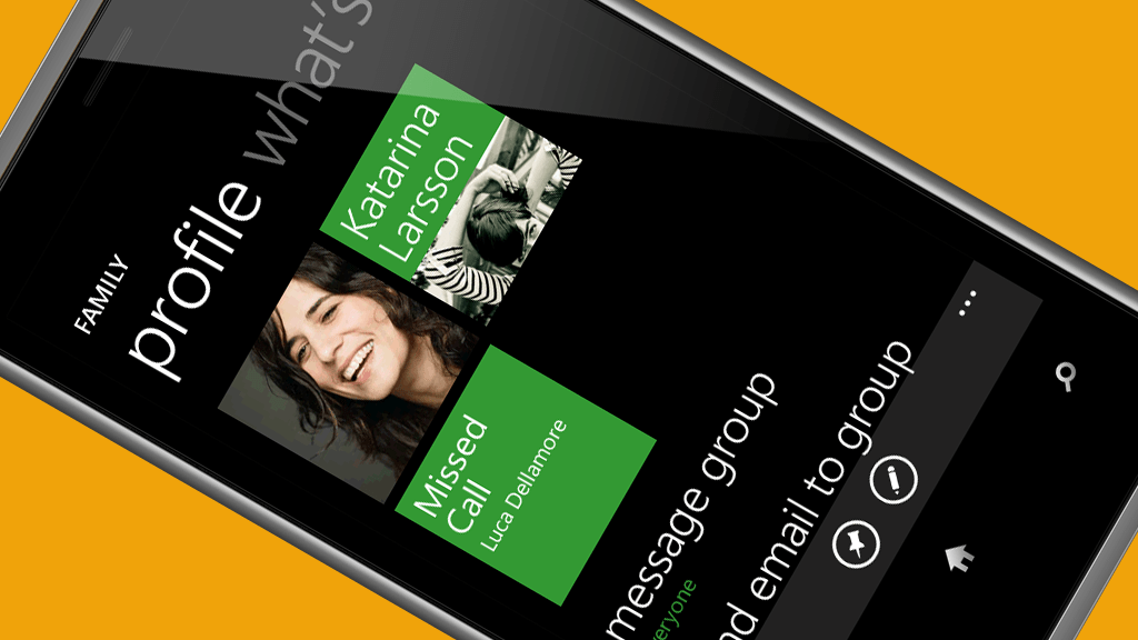 Start screen with group tile, and group card with profile, what’s new, and pictures pivots